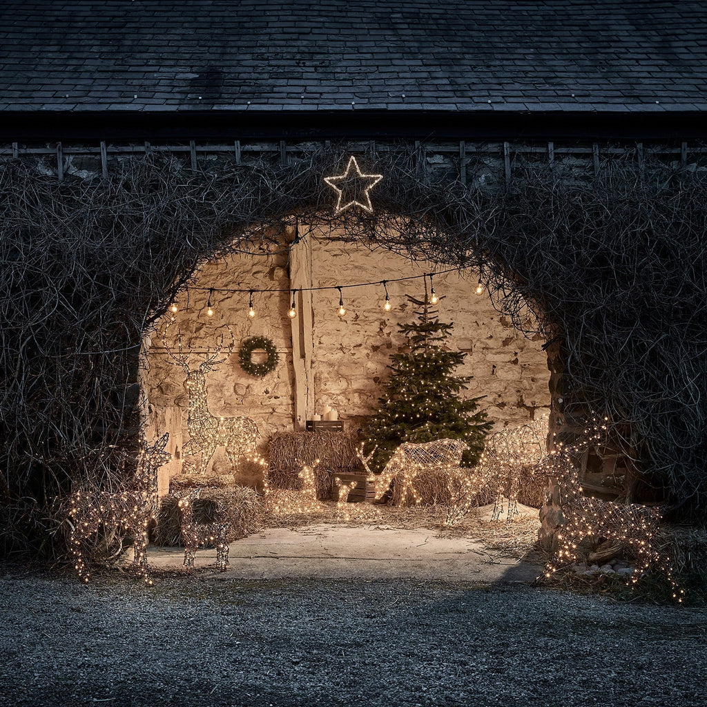 Com estruturas de metal feitas à mão e envolto em um falso rattan marrom à prova d'água, estas figuras festivas ganham vida com LEDs em tom branco quente cuidadosamente posicionados, proporcionando um brilho impressionante ao anoitecer.